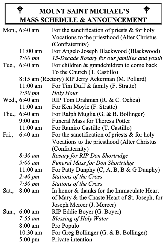 MOUNT SAINT MICHAEL’S MASS SCHEDULE