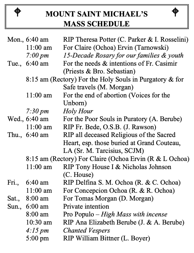MOUNT SAINT MICHAEL’S MASS SCHEDULE