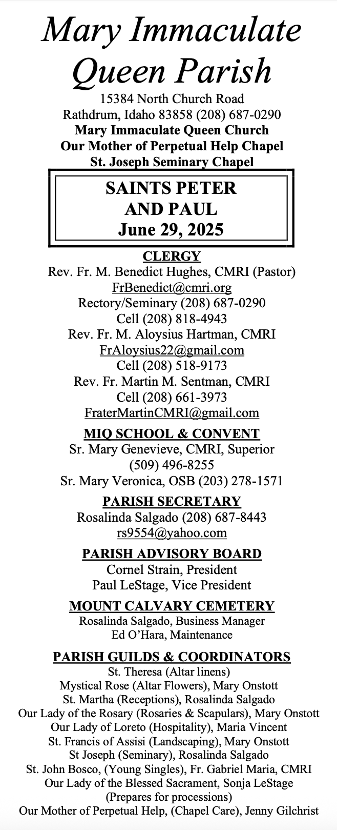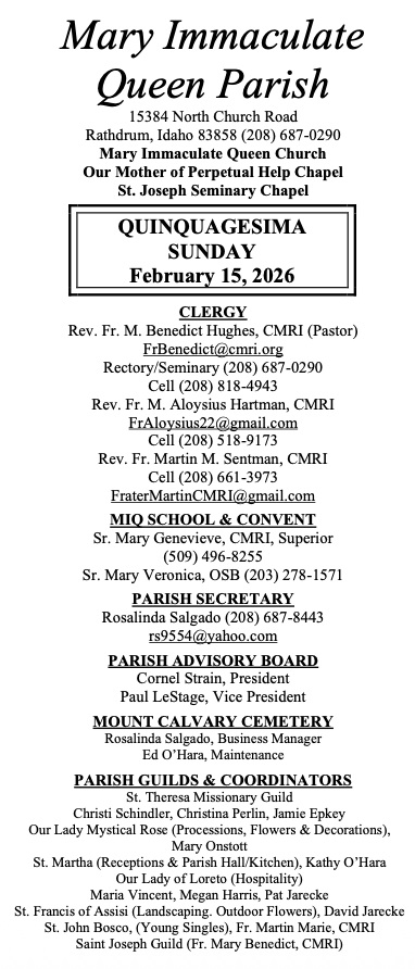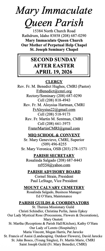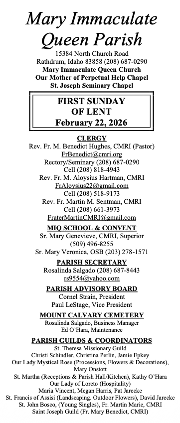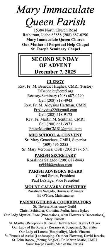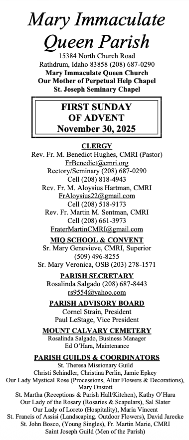 The pastor of Mary Immaculate Queen Church is Father Benedict Hughes, CMRI, and the assistant pastors are Father Gabriel Lavery, CMRI and Father Aloysius Hartman, CMRI. The priests belong to the religious Congregation of Mary Immaculate Queen. The bishop and priests of the Congregation of Mary Immaculate Queen (CMRI) offer only the Tridentine Latin Mass in all the churches and chapels they serve. Remaining faithful to all of the Church’s venerable teachings and traditions, Mary Immaculate Queen Church reflects the truths and doctrines that will never change with the times.