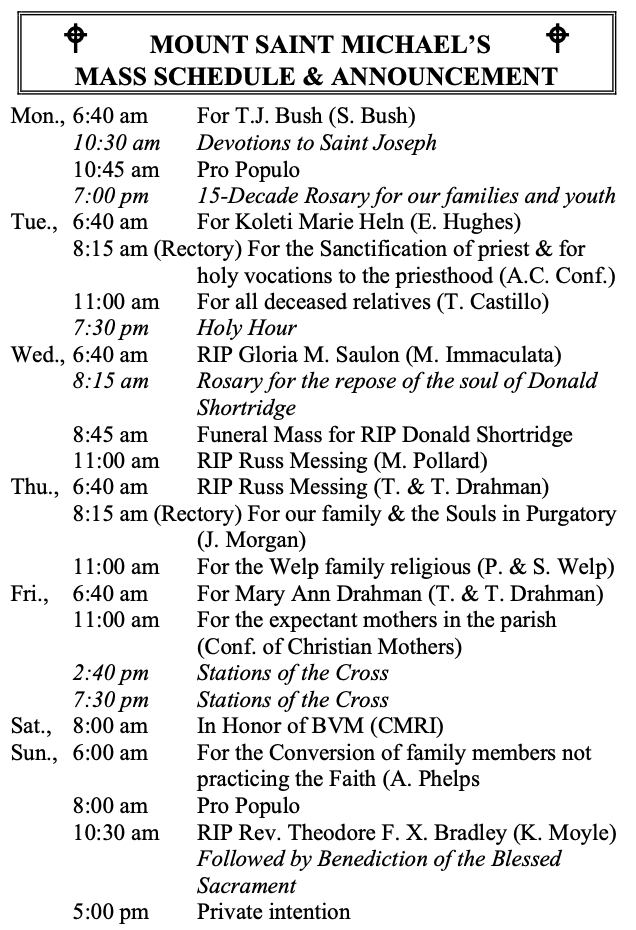 MOUNT SAINT MICHAEL’S MASS SCHEDULE & ANNOUNCEMENT