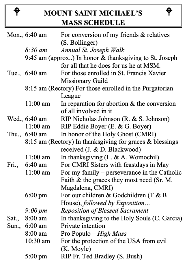 MOUNT SAINT MICHAEL’S MASS SCHEDULE