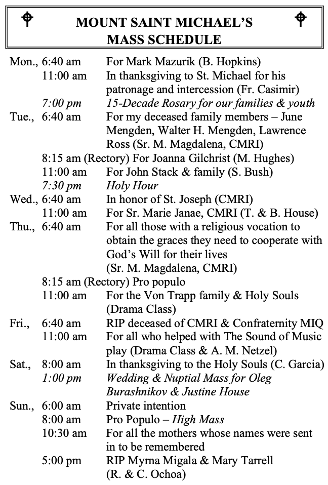 MOUNT SAINT MICHAEL’S MASS SCHEDULE