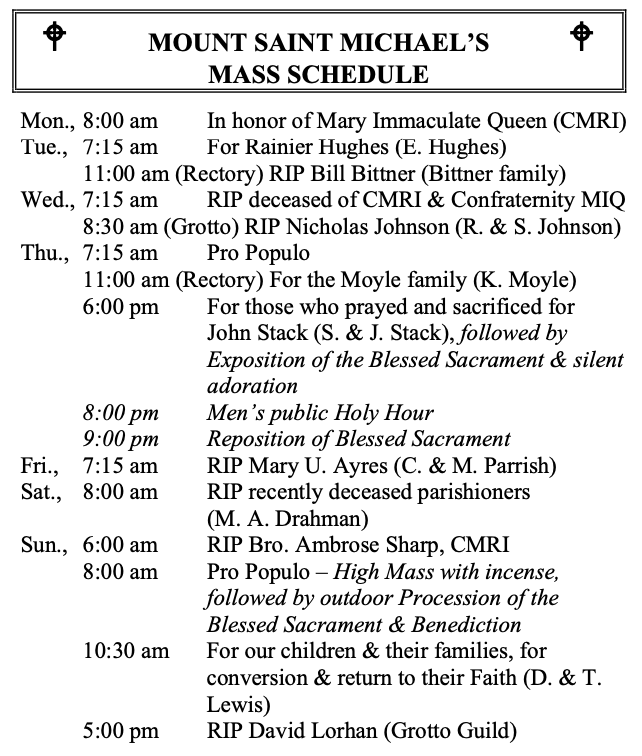 MOUNT SAINT MICHAEL’S MASS SCHEDULE