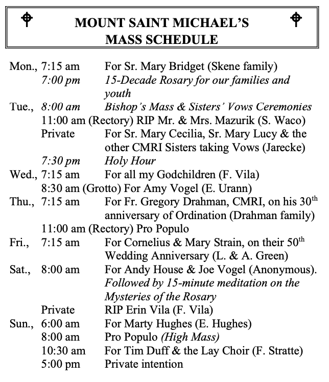 MOUNT SAINT MICHAEL’S MASS SCHEDULE