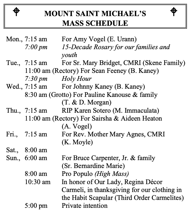 MOUNT SAINT MICHAEL’S MASS SCHEDULE