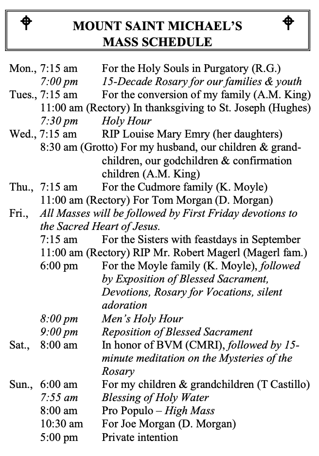 MOUNT SAINT MICHAEL’S MASS SCHEDULE