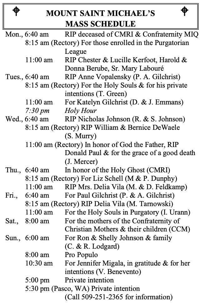 MOUNT SAINT MICHAEL’S MASS SCHEDULE