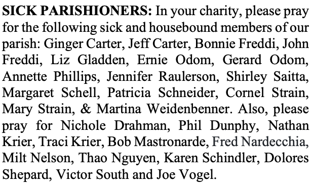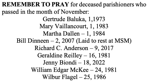 There will be a breakfast next Sunday after each Mass for the support of the seminary. See the flyer in the vestibule for details. We welcome help from parishioners who want to donate desserts to the breakfast. Also, if you wish to order Thanksgiving pies, please fill out an order form and leave it with us no later than Tuesday of this week. The pies will be available after Mass next Sunday.