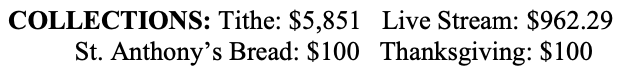 for needy families will once again be provided by our parish this Thanksgiving. Donations of non-perishable food items may be placed in the boxes provided in the vestibule. Monetary donations should be placed in the Sunday collection in a clearly marked envelope. Monday, Nov. 20, is the deadline for submitting donations of food or money.